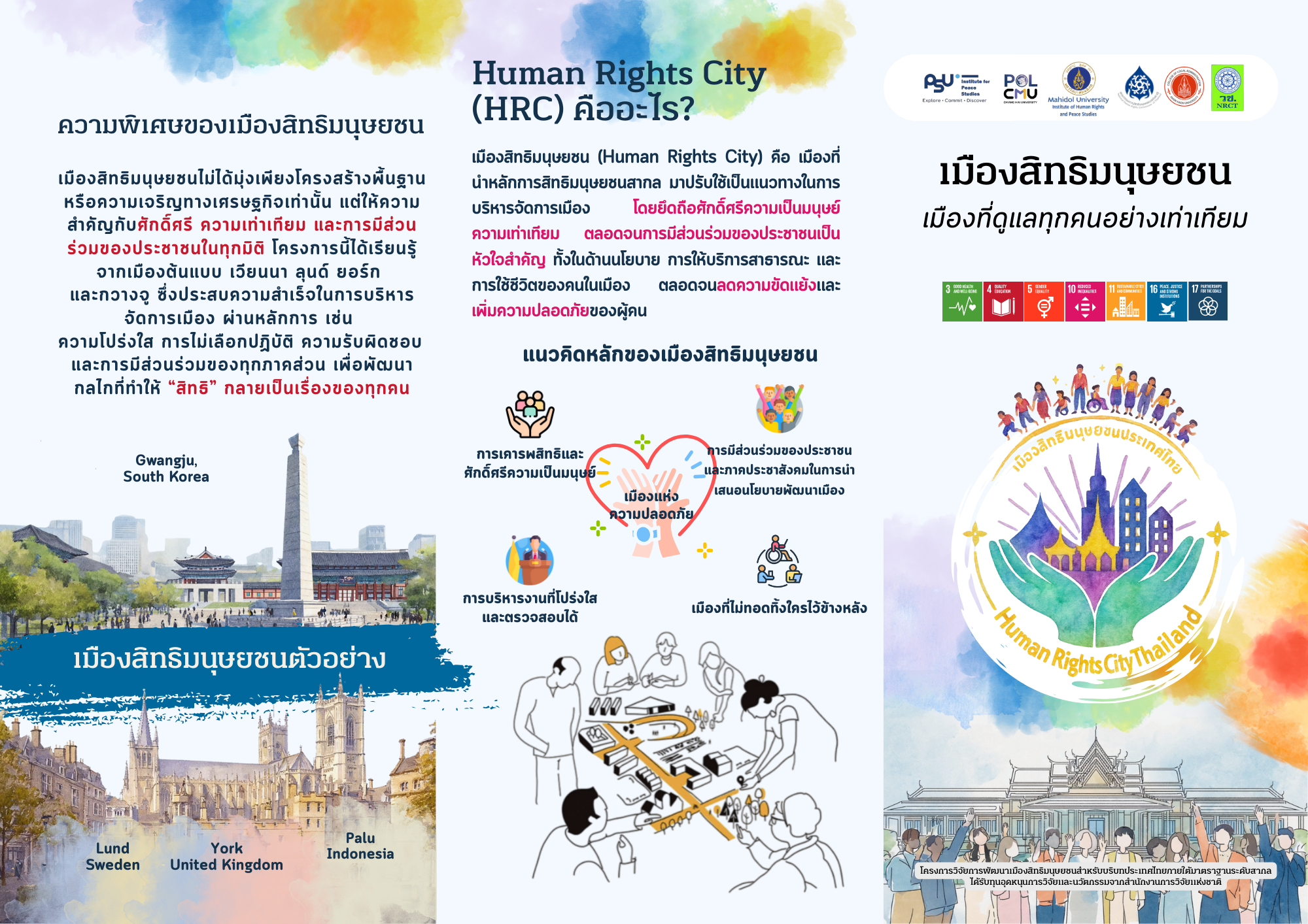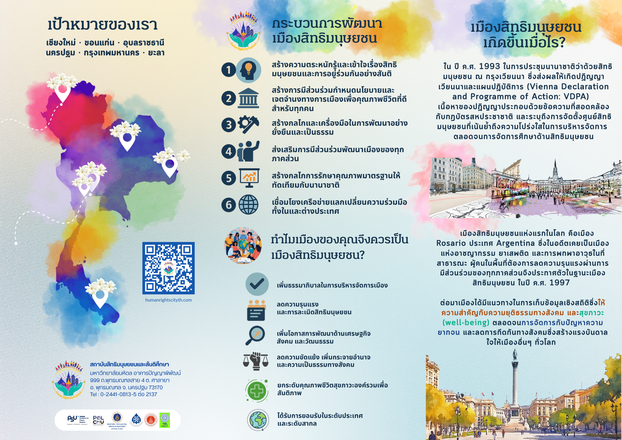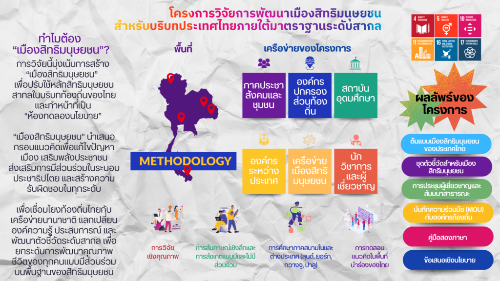 โครงการวิจัยเรื่อง “การพัฒนาเมืองสิทธิมนุษยชนของประเทศไทยบนฐานมาตรฐานสากล” จึงมีวัตถุประสงค์เพื่อศึกษากระบวนการ กลไก และองค์ประกอบของเมืองสิทธิมนุษยชนจากเมืองต้นแบบในระดับนานาชาติ อาทิ เมืองเวียนนา ลุนด์ ยอร์ก และกวางจู ควบคู่กับการวิเคราะห์บริบท ศักยภาพ และข้อจำกัดของเมืองในประเทศไทย ผ่านการทำงานร่วมกับองค์กรปกครองส่วนท้องถิ่น ภาคประชาสังคม ภาควิชาการ และเครือข่ายด้านสิทธิมนุษยชน เพื่อพัฒนาองค์ความรู้ โมเดล และข้อเสนอเชิงนโยบายที่สามารถนำไปปรับใช้ได้จริงในบริบทไทย